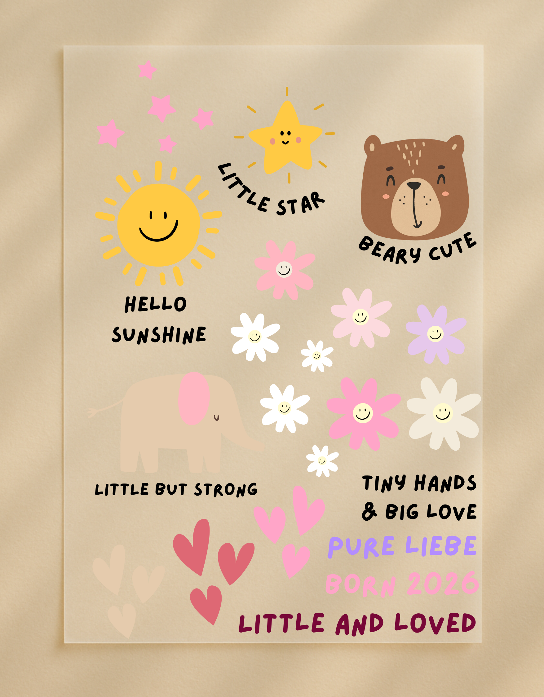 Für die besonderen Momente, in denen ein kleines Wunder willkommen geheißen wird: Dieses liebevoll gestaltete Bügelbild-Set kombiniert moderne Farben mit fröhlichen Illustrationen wie Sonne, Stern, Bär & Co. Perfekt für Babypartys, Babyshowers oder personalisierte Geschenke, die von Herzen kommen. Die vielseitigen Motive lassen sich wunderbar miteinander kombinieren und machen jedes Outfit oder Deko-Element zu einem strahlenden Highlight.